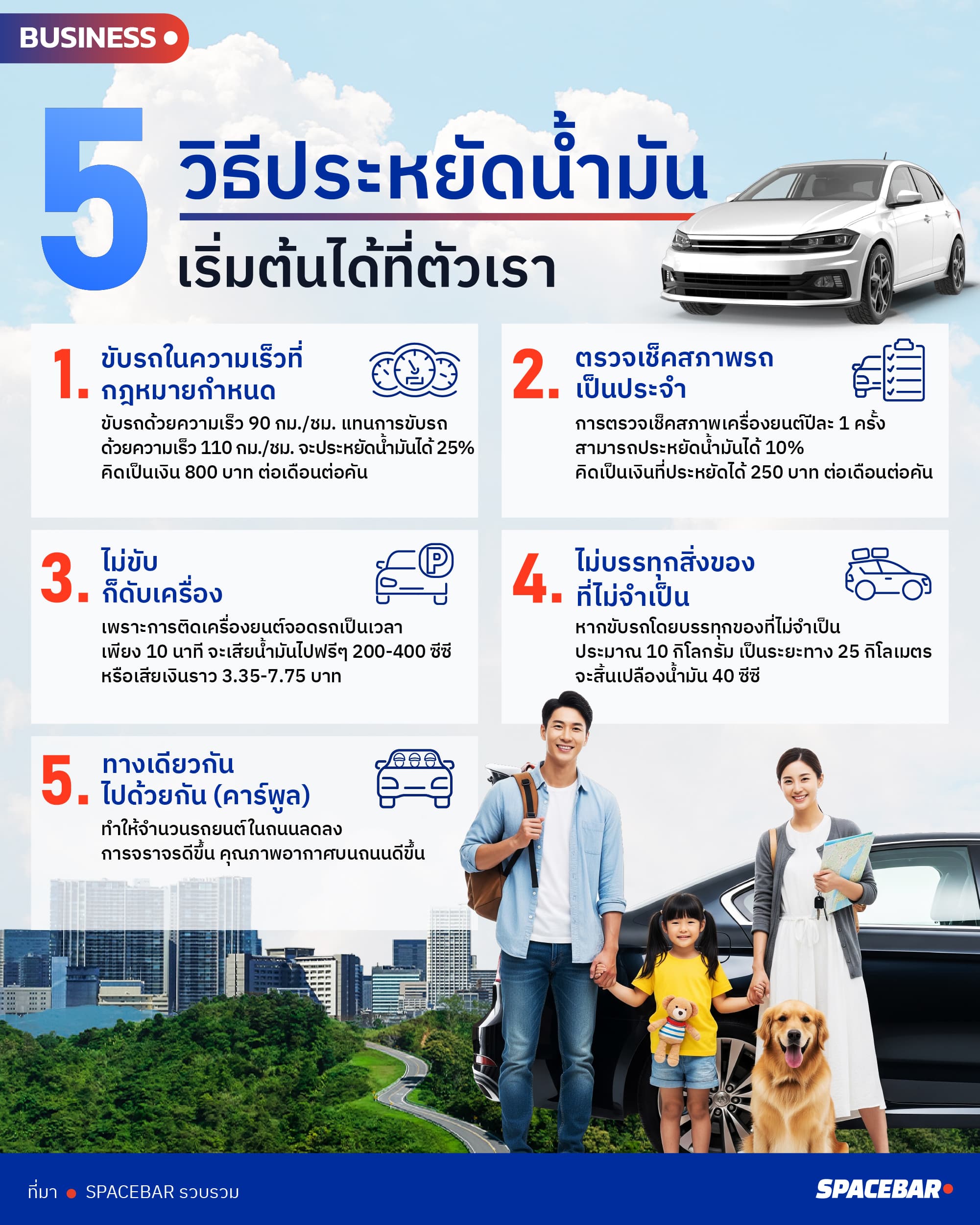 1.ขับรถในความเร็วที่กฎหมายกำหนด หากขับรถด้วยความเร็ว 90 กม./ชม. แทนการขับรถด้วยความเร็ว 110 กม./ชม. จะประหยัดน้ำมันได้ 25% คิดเป็นเงิน 800 บาทต่อเดือนต่อคัน หรือ 9,600 บาทต่อปีต่อคัน