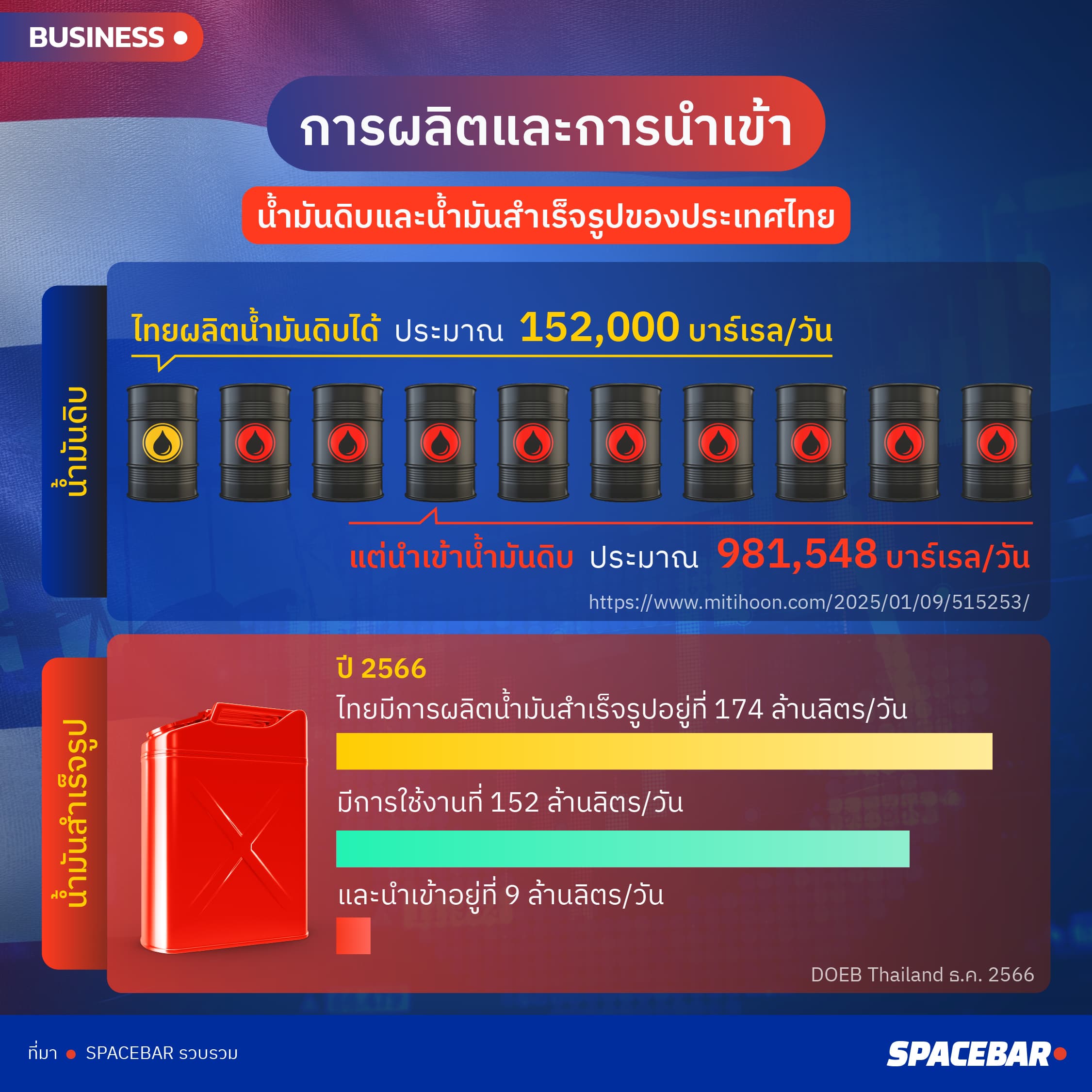 ประเทศไทยผลิตน้ำมันดิบได้ประมาณ 152,000 บาร์เรลต่อวัน แต่ความต้องการใช้น้ำมันสำเร็จรูป อยู่ที่ประมาณ 1,032,000 บาร์เรล/วัน จึงต้องมีการนำเข้าน้ำมันดิบประมาณ 981,548 บาร์เรลต่อวันเพื่อให้เพียงพอต่อการใช้งานภายในประเทศ ซึ่งจากข้อมูลของกระทรวงพลังงาน ปี 2566 รายงานว่าความต้องการใช้น้ำมันในประเทศเพิ่มขึ้นถึง 2.7% ต่อปี โดยในส่วนของน้ำมันสำเร็จรูป ปี 2566 พบว่าประเทศไทยมีการผลิตอยู่ที่ 174 ล้านลิตร/วัน มีการใช้งานที่ 152 ล้านลิตร/วัน และนำเข้าอยู่ที่ 9 ล้านลิตร/วัน