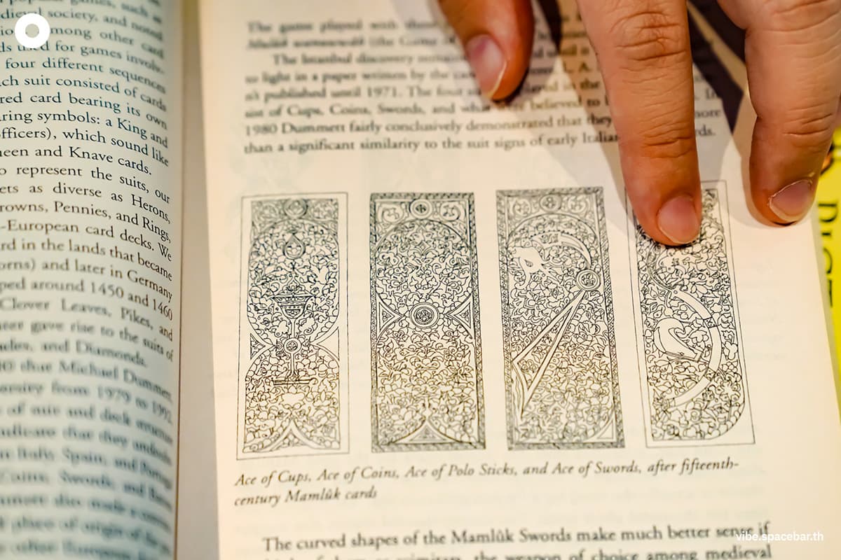 “หากจะถามถึงจุดเริ่มต้นของไพ่ทาโรต์ มันไม่ได้มีข้อสรุปที่แน่ชัดนัก เนื่องจากต้นกำเนิดของการผลิตกระดาษรายแรกที่แท้จริงของโลกยังคงเป็นที่ถกเถียงกัน บางข้อสันนิษฐานว่ามาจากจีน บ้างว่ามาจากอินเดีย และบางแห่งก็ว่ามาจากอาหรับ อย่างในเล่มนี้เชื่อว่ามีจุดกำเนิดที่อาหรับ โดยเขาจะแสดงหน้าไพ่ทาโรต์แรกเริ่มในยุคนั้นที่มีความอ่านยาก ลวดลายสลับซับซ้อน และมีวัตถุวางซ่อนอยู่” อาจารย์เล่าพร้อมเปิดหนังสือไปยังหน้าที่มีภาพไพ่ 1 เหรียญ, 1 ถ้วย, 1 ดาบ และ 1 ไม้เท้าปรากฏอยู่