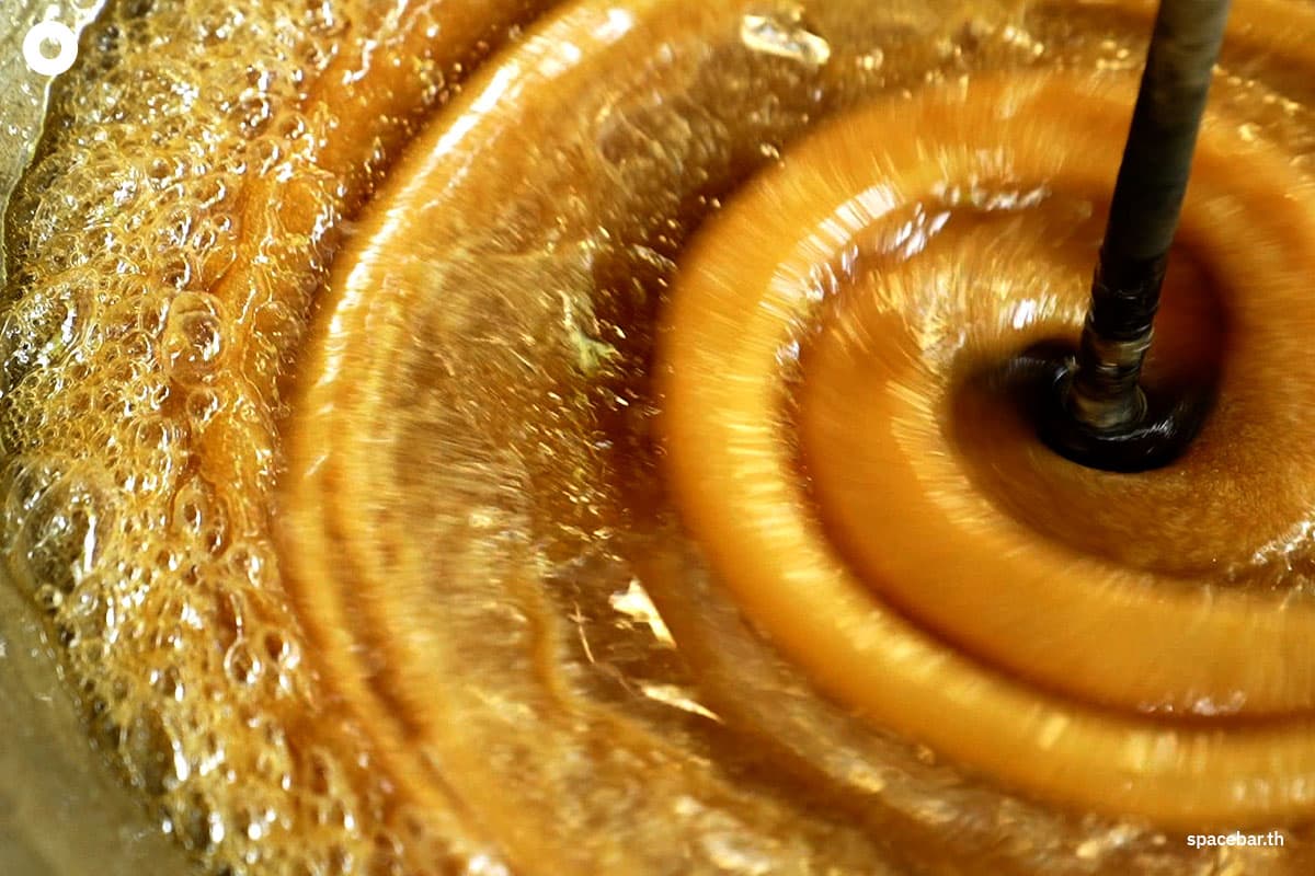 "ถัวเฉลี่ยก็ประมาณชั่วโมงกว่าจะได้กระทะหนึ่ง ต้มให้มันงวดจนใกล้แห้งแล้วเราถึงเอาลงมาปั่นถึงจะใช้ได้ ต้องคนเคยเคี่ยวเคยทำนะถึงจะดูได้ว่าอันนี้ใช้ได้แล้ว อันนี้ยังไม่ได้ ดูจากปุดๆๆ" ป้าติ๋วหันมาบอกเรา