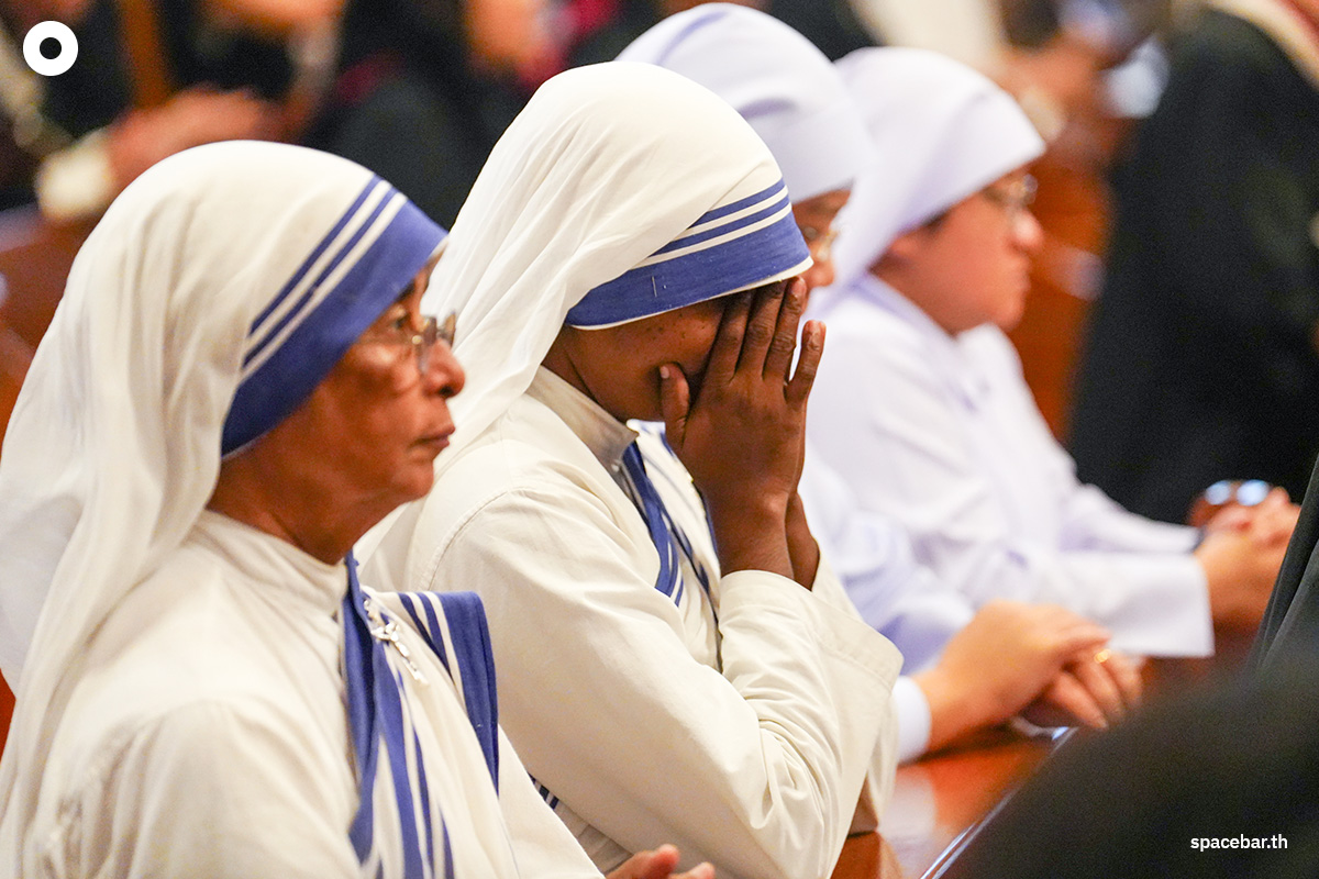 พระคาร์ดินัลไมเกิ้ลมีชัย กิจบุญชู ทรงวางช่อดอกไม้และเทียน เพื่อเป็นสัญลักษณ์ของคำภาวนาและการร่วมใจอุทิศให้กับดวงพระวิญญาณของพระสันตะปาปาฟรานซิส หลังมิสซาบูชาขอบพระคุณ แด่ดวงพระวิญญาณสมเด็จพระสันตะปาปาฟรังซิส โดย อาร์ชบิชอป ปีเตอร์ ไบรอัน เวลส์ เอกอัครสมณทูตนครรัฐวาติกัน ประจำประเทศไทย ณ อาสนวิหารอัสสัมชัญ (บางรัก)